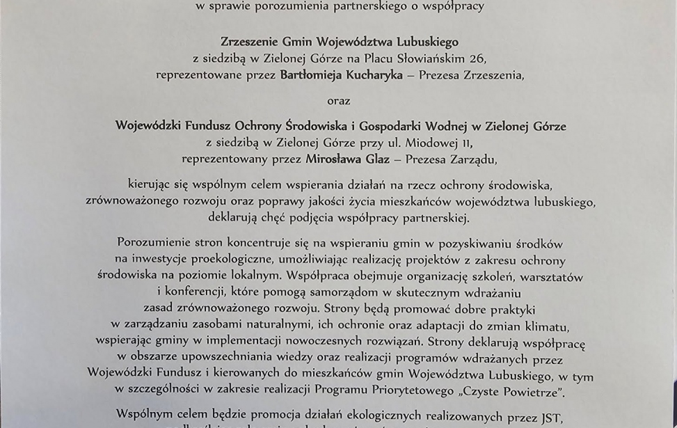 Podpisany dziś w tej sprawie list intencyjny zakłada podjęcie wzajemnych wysiłków w celu jak najlepszego wykorzystania przez gminy oferty finansowej WFOŚiGW w Zielonej Górze na inwestycje proekologiczne. Porozumienie gwarantuje również dwustronne działania promujące dobre praktyki w zakresie zarządzania zasobami naturalnymi czy organizacji wspólnych spotkań, szkoleń i prelekcji w zakresie nowych wyzwań i trendów w polityce ochrony środowiska.