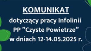 Informujemy, że Infolinia PP „Czyste Powietrze” w poniedziałek 12 maja 2025 r. będzie dostępna jedynie do godz. 11:30.