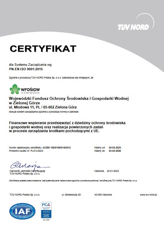i innych stron zainteresowanych, WFOŚiGW w Zielonej Górze wdrożył System Zarządzania Jakością zgodny